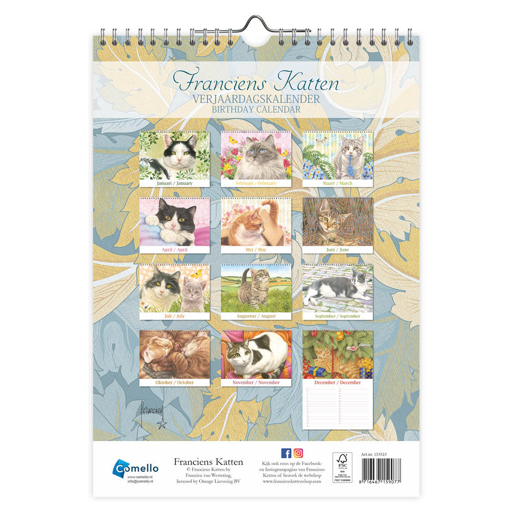 Deze luxe en stijlvol vormgegeven verjaardagskalender van Francien’s Katten bevat elke maand een prachtige tekening van een van de katten van Francien van Westering. De kalender is makkelijk op te hangen door de ringband met ophangoog aan de bovenzijde. Francien van Westering, de bekendste kattentekenares van Nederland, schrijft en tekent al haar hele leven over poezen en katten. Als geen ander weet zij niet alleen het uiterlijk, maar ook het karakter van haar katten trefzeker over te brengen.